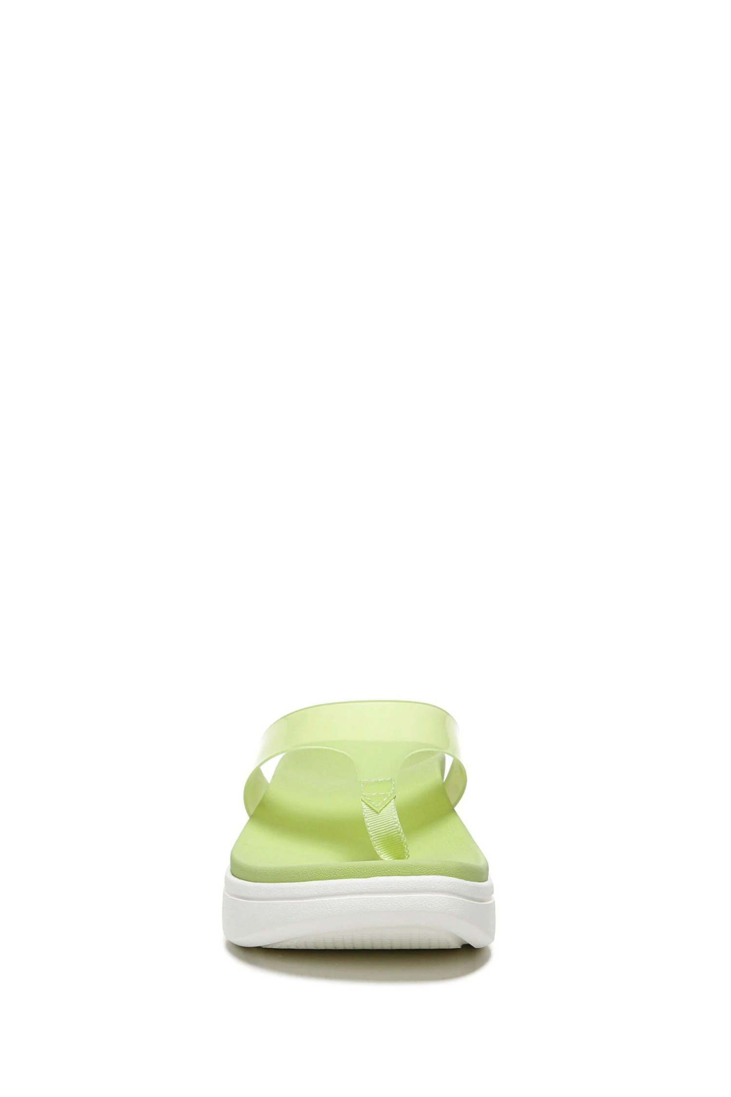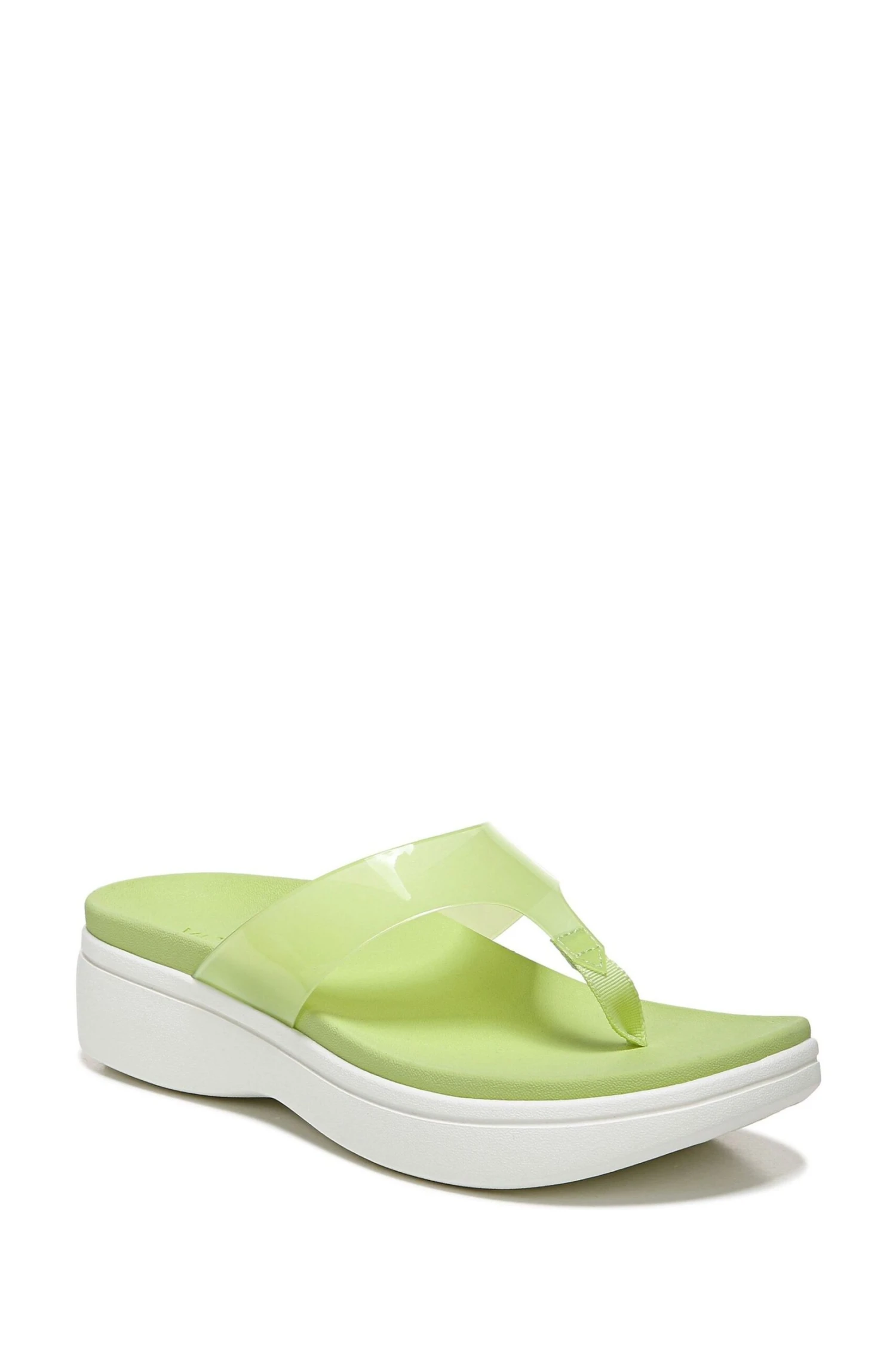 The classic toe post sandal goes next level with walkable wedge height and translucent plastic straps that serve beach chic style.