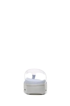 The classic toe post sandal goes next level with walkable wedge height and translucent plastic straps that serve beach chic style.